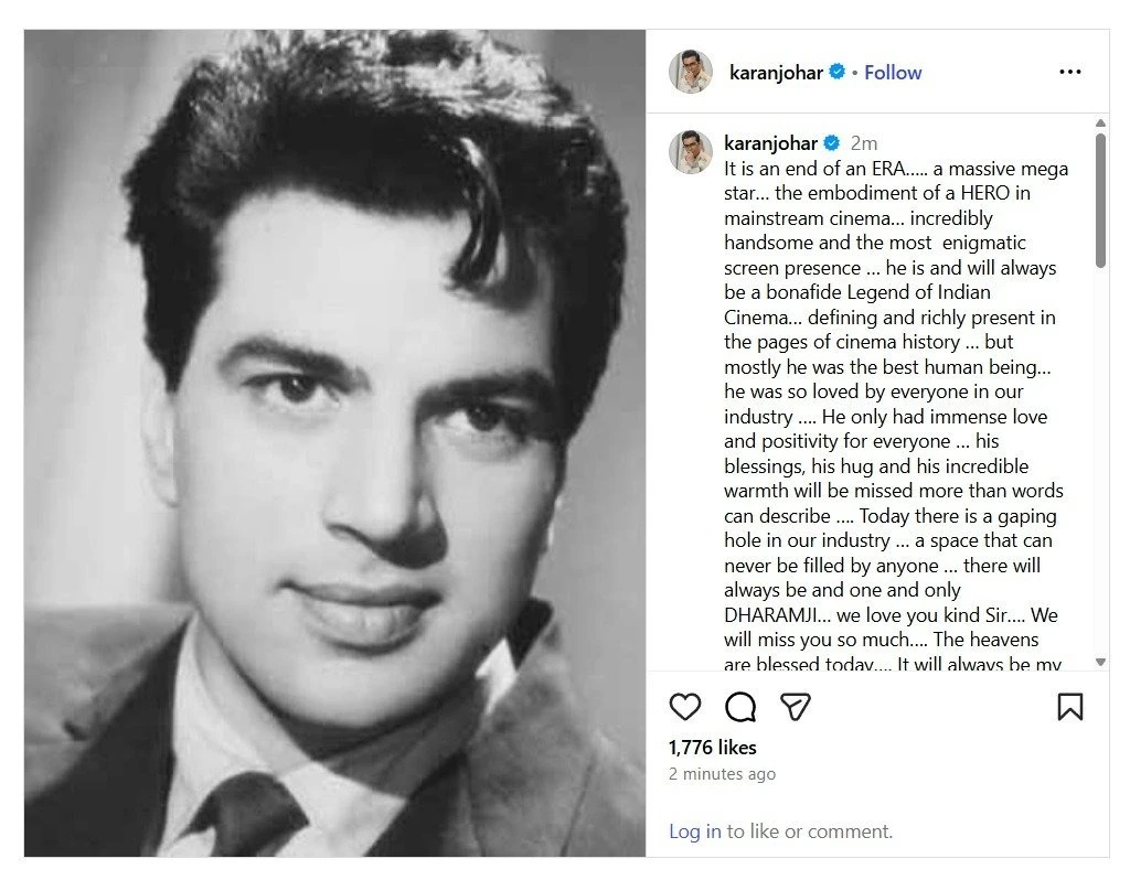 फिल्म डायरेक्टर करण जौहर ने इंस्टाग्राम पर धर्मेंद्र के निधन को लेकर पोस्ट किया, “यह एक युग का अंत है… एक बहुत बड़ा मेगा स्टार… मेनस्ट्रीम सिनेमा में एक HERO का रूप… बहुत हैंडसम और सबसे रहस्यमयी स्क्रीन प्रेजेंस… वह इंडियन सिनेमा के एक असली लेजेंड हैं और हमेशा रहेंगे… सिनेमा के इतिहास के पन्नों में खास और शानदार तरीके से मौजूद हैं…”