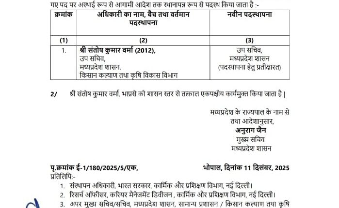 भोपाल : मध्यप्रदेश में ब्राम्हण समाज की बेटियों पर अभद्र टिप्पणी करने वाले IAS अधिकारी संतोष वर्मा को बर्खास्त करने की कार्रवाई की जाएगी. मुख्यमंत्री डॉ. मोहन यादव ने आईएएस पर कार्रवाई के आदेश दे दिए हैं. मुख्यमंत्री के आदेश पर राज्य शासन आईएएस संतोष वर्मा को बर्खास्त करने के लिए केन्द्र को पत्र भेजने जा रही है. वहीं, गुरुवार रात आईएएस वर्मा को कृषि विभाग से भी हटा दिया गया है. उधर इस मामले को लेकर 65 ब्राम्हण संगठनों द्वारा 12 दिसंबर से तीन दिवसीय आंदोलन शुरू किया जा रहा था.